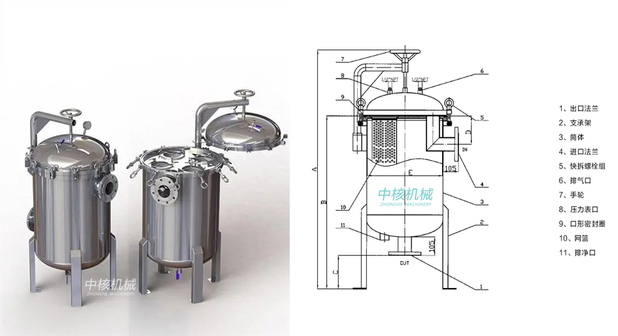 袋式过滤器是一种结构新颖、体积小、操作简便灵活、节能、密闭工作的多用途过滤设备。袋式过滤器是一种压力式过滤装置,主要由过滤筒体、过滤筒盖、快开机构、不锈钢滤篮等部件组成。过滤机内部由金属网篮支撑滤袋,液体由过滤器外壳的旁侧入口流进滤袋,经滤袋过滤后从出口流出,杂质被拦截在滤袋中。该机更换滤袋十分方便,过滤基本无物料消耗。